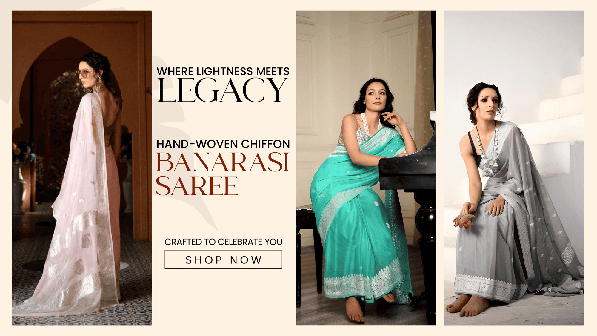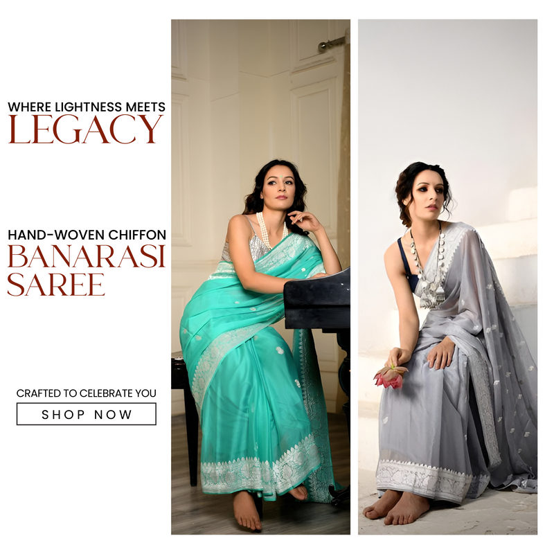 Discover the ethereal beauty of our Pure Khaddi Kadhwa Banarasi Chiffon Georgette Saree. Each piece is a masterpiece of traditional Banarasi craft...