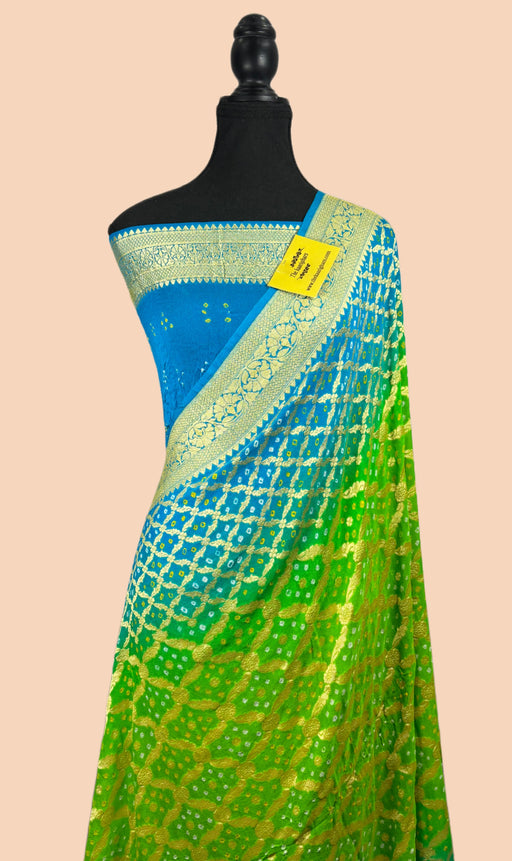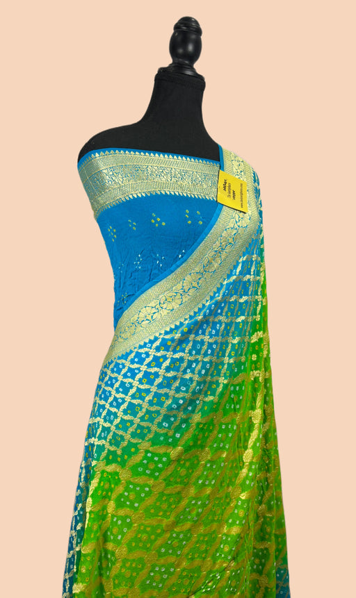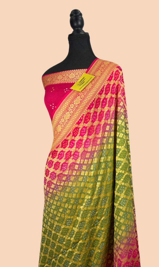 View full detailsEmbrace timeless elegance with our Handwoven Pure Georgette Bandhani Banarasi Saree, a masterpiece of traditional Indian craftsmanship. This saree ...