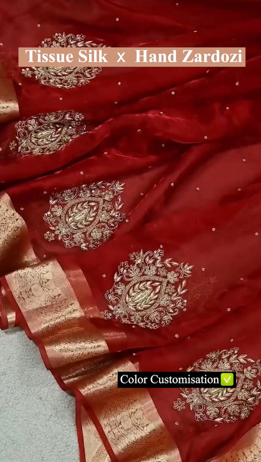 Redefine Opulence with Pure Katan Banarasi Handloom Saree - Hand Zardozi Immerse yourself in the splendor of tr...